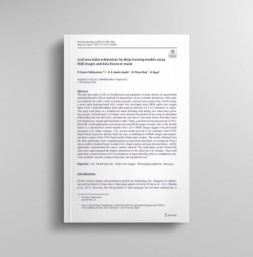 Apolo-Apolo, O.E., Pérez-Ruiz, M., Martínez-Guanter, J., & Egea, G. (2020.) A Mixed Data-Based Deep Neural Network to Estimate Leaf Area Index in Wheat Breeding Trials. Agronomy, 10, 175 (Read more)